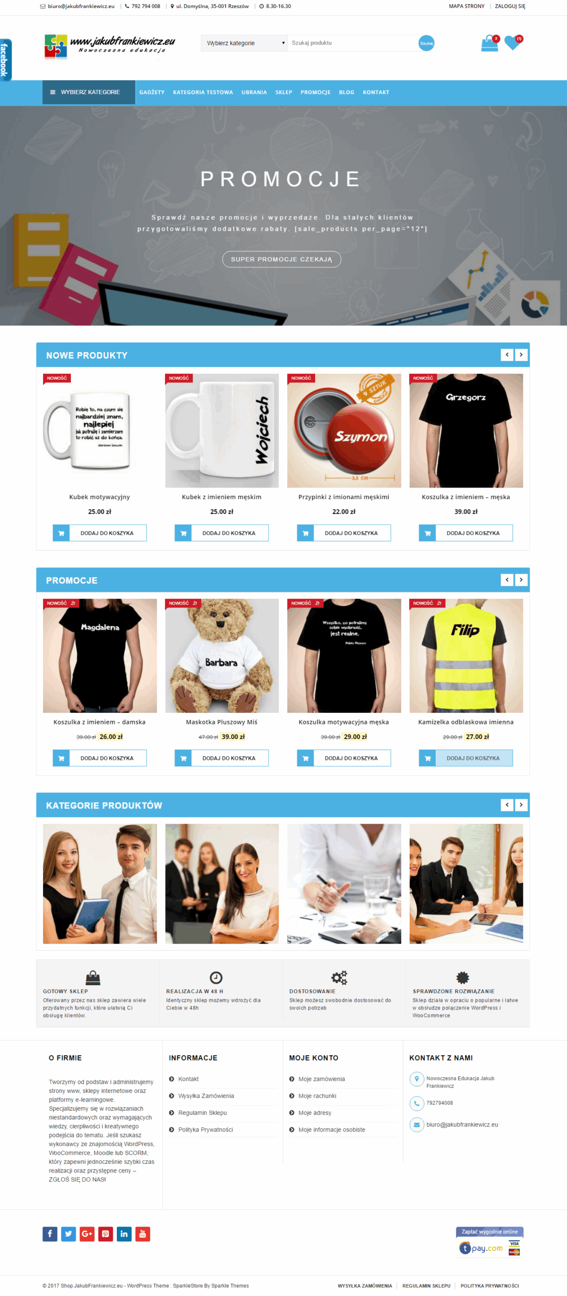 Na życzenie istnieje możliwość rozbudowania opcji dostępnych w sklepie, zmianę kolorystyki oraz przeprowadzenia szkolenia z obsługi WordPress i WooCommerce.